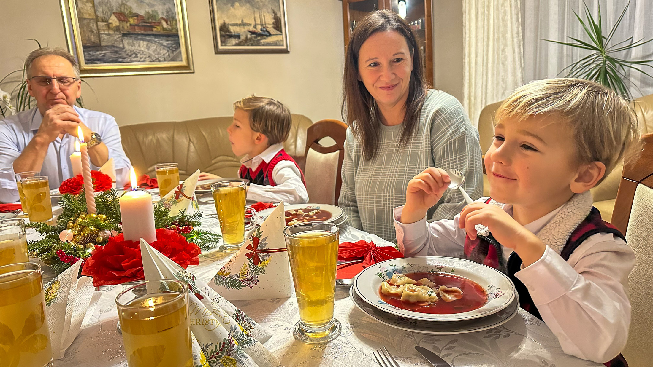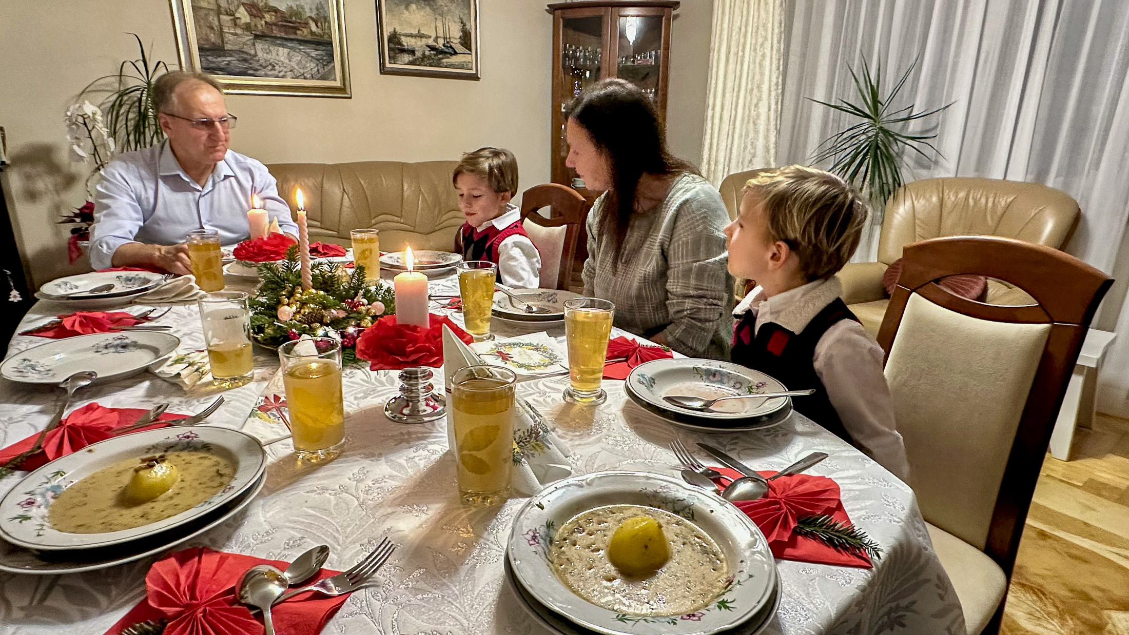 We spent Christmas Eve at Ciocia Basia’s house with Wujek Krzysiek, Konrad, and his wife Magda. A traditional Wigilia supper was served, featuring all twelve meatless dishes, along with drinks—each symbolizing one of the twelve apostles. As tradition goes, we shared pieces of opłatek (a thin Christmas wafer), exchanging wishes for health, happiness, and peace. Magda read a short passage from the Bible before we broke the opłatek and began the meal.