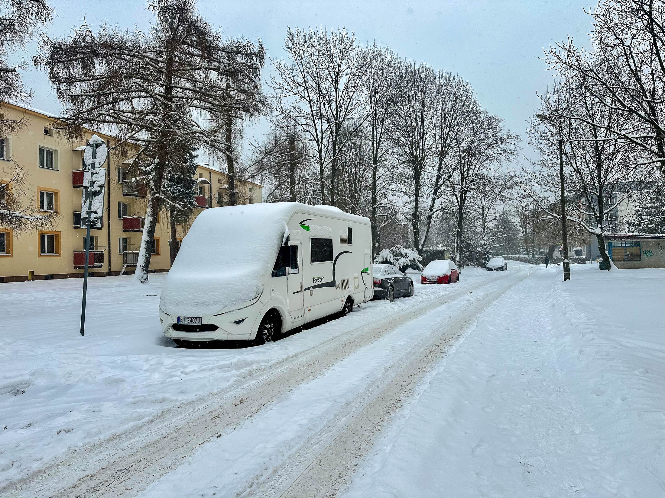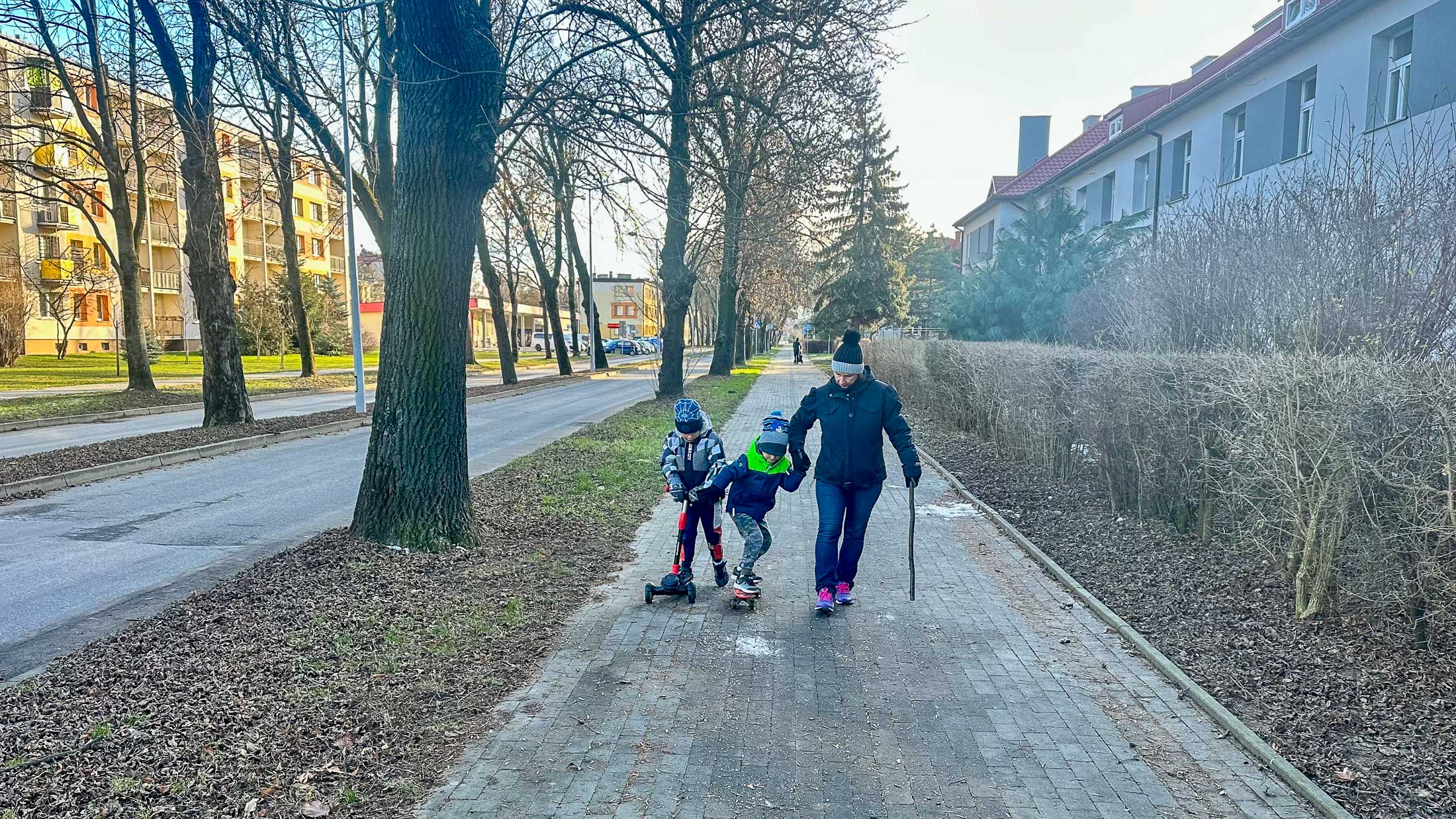 With the cold weather keeping us inside, we welcomed a walk outside to stretch our legs and get some steps in while the boys rode their toys. Before heading out, we had a visit from mieszkaniówka. The maintenance crew came by to chip away a few loose pieces of concrete from our balcony ceiling. We called it in on New Year’s Eve after hearing a chunk fall. Someone came the same day but didn’t have a ladder or tools, so they returned on Friday to finish removing the remaining loose pieces. Our building, along with several others in the area, is overdue for some exterior maintenance.