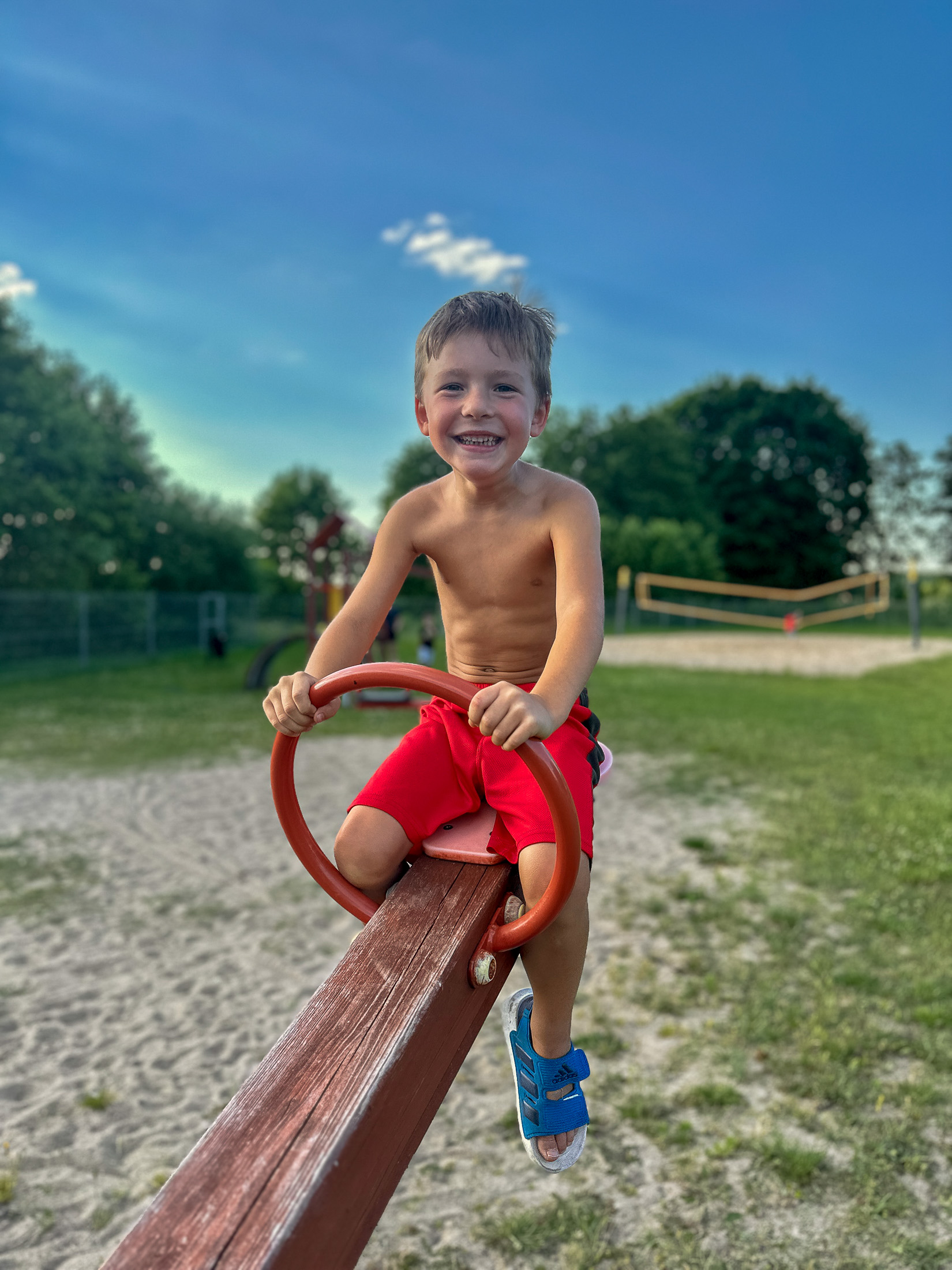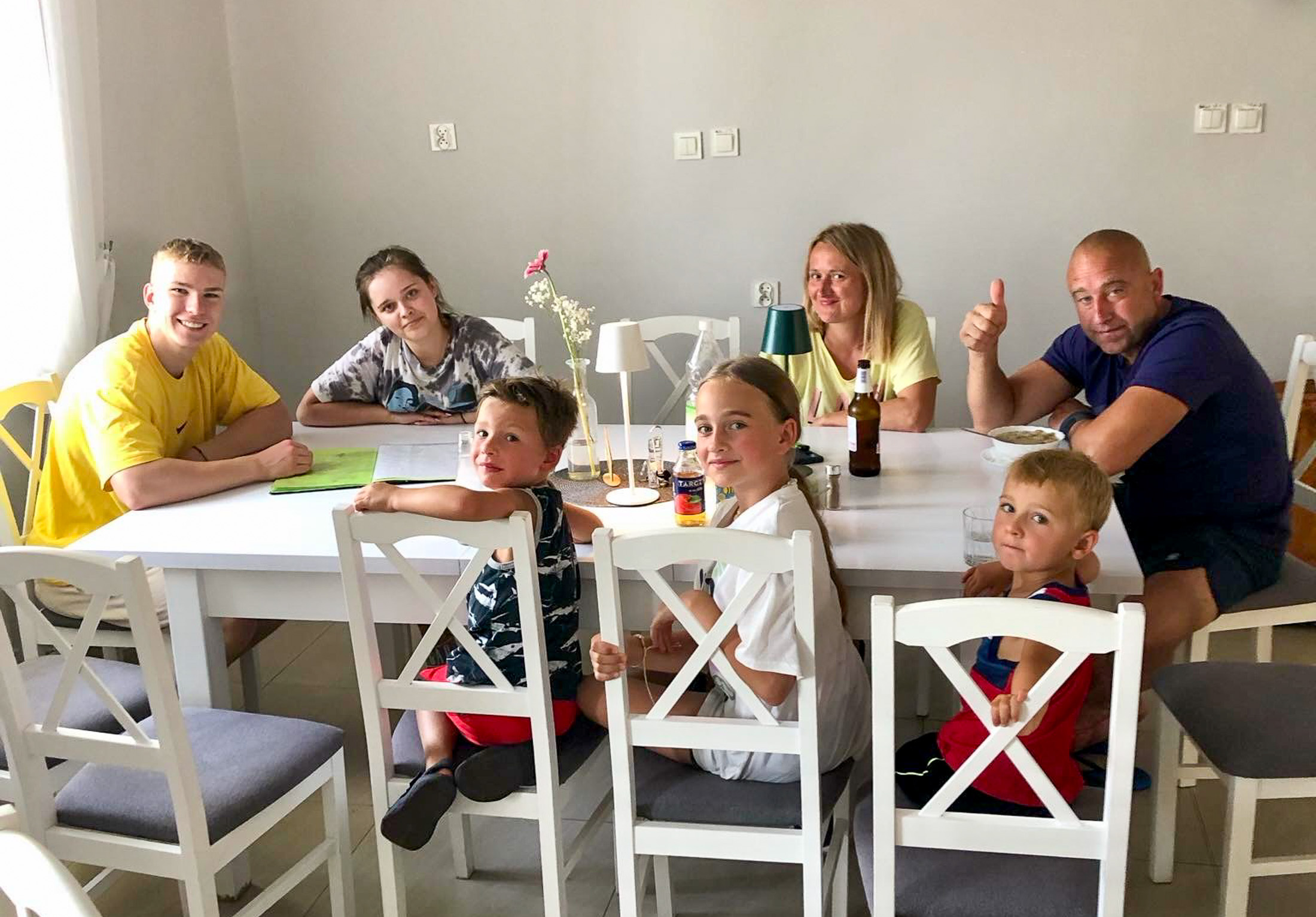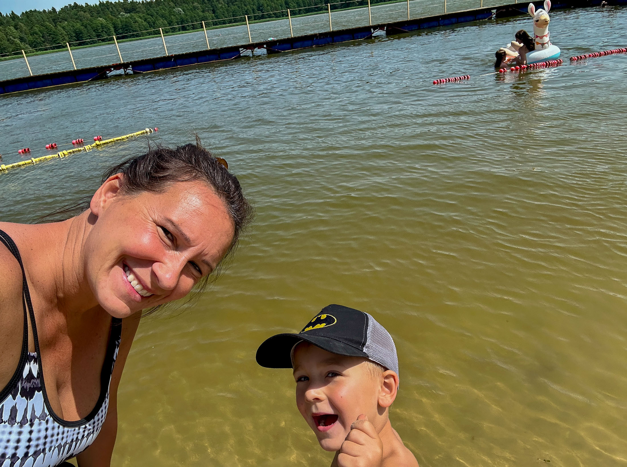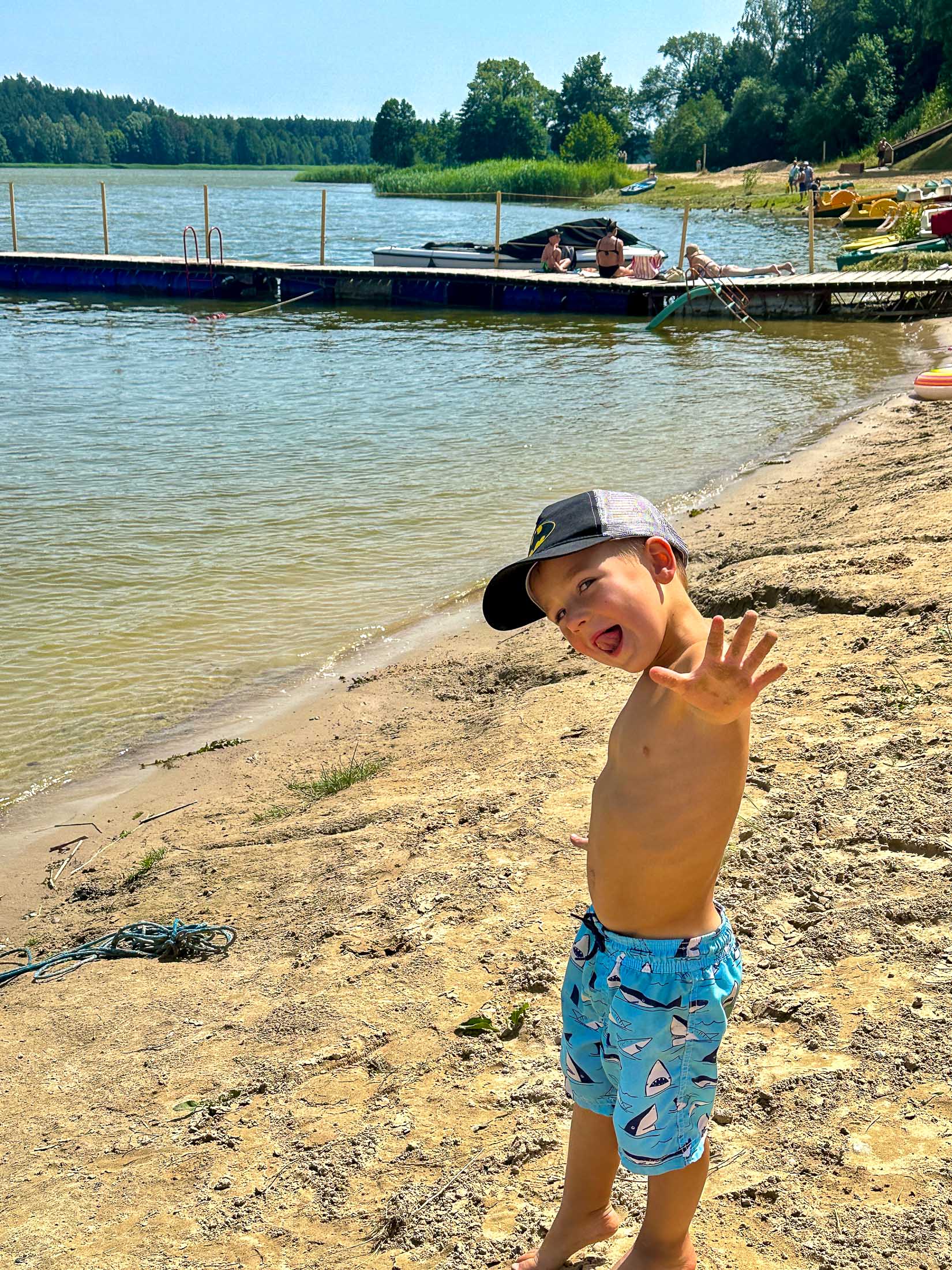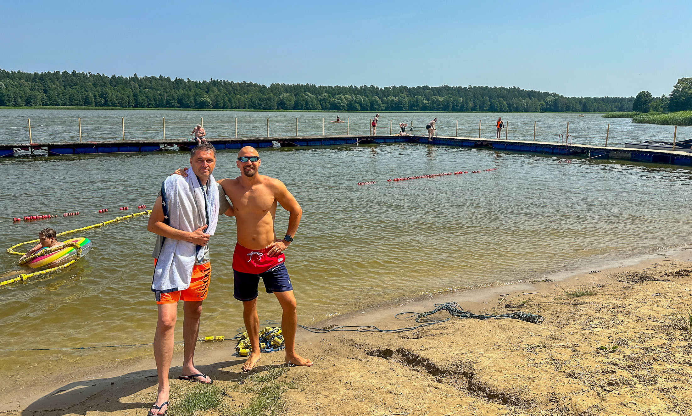 Darek invited us to spend the weekend there with his family and our old childhood friend Marek and his family. Darek, Beata, Martyna, and her boyfriend Filip stayed in their cabin, while Marek, Natalia, and their daughter Amelka rented another one nearby. We booked a room at the small on-site hotel — simple, with no windows except a skylight, not particularly comfortable, and way too expensive for what it was. We even had to bring in a fan we found in the hallway just to keep the room cool since we were on the top floor and could feel the heat radiating from the roof. Had we known, we definitely would’ve booked a cabin like Marek’s — far more space, better comfort, and a great lake view for less money.