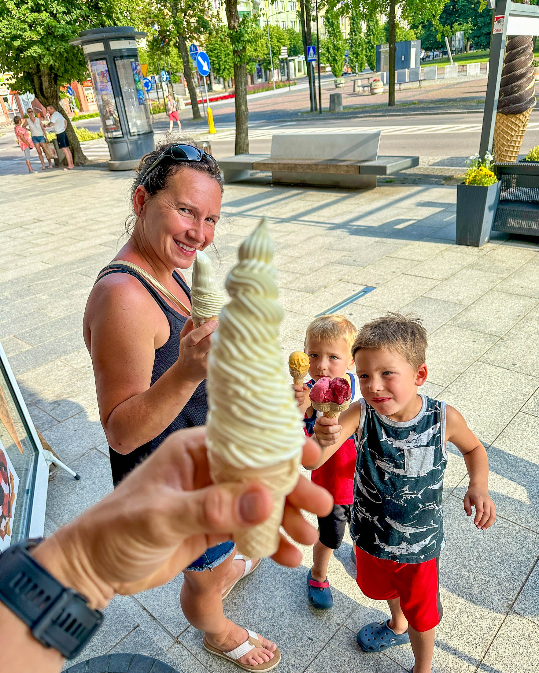 Before heading home, we made one last stop in town for some local ice cream — the perfect way to wrap up the weekend. Sylwia and I went for classic soft-serve vanilla swirls, while the boys each picked their favorites — one with a single scoop and the other proudly double-scooped.