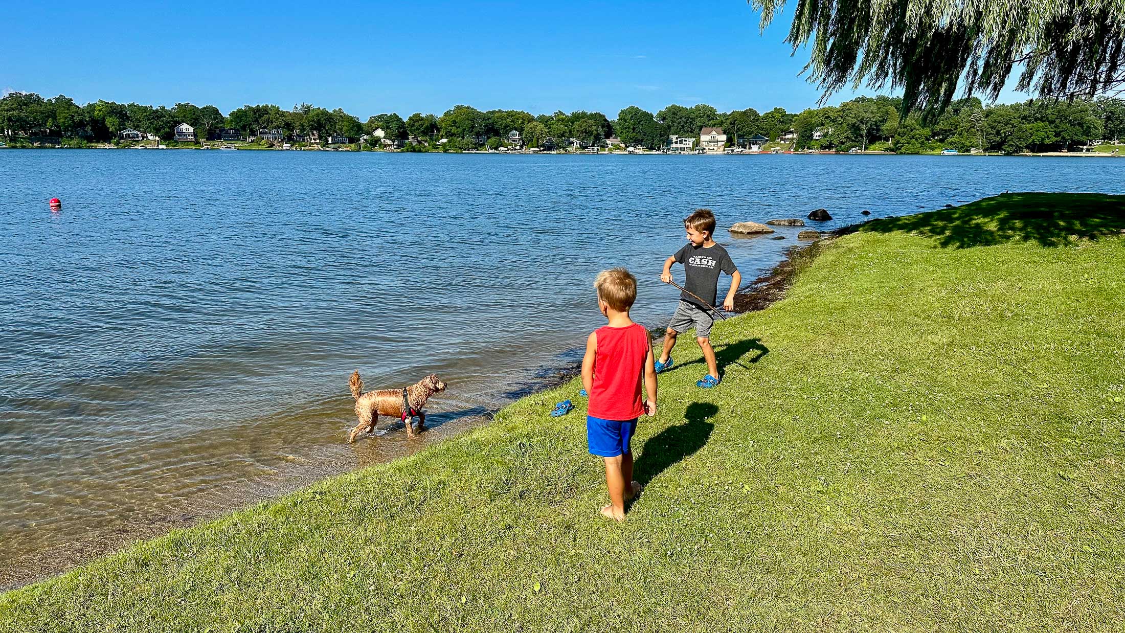 The boys were on dog duty at Uncle Filip’s on Friday, stopping by in the afternoon to let Zoey out so she could do her business and stretch her legs—Ania wasn’t getting home until after 7 p.m. We took her down to the lake, where she happily swam after a stick Grayson kept throwing. Like our boys, she absolutely loves the water.