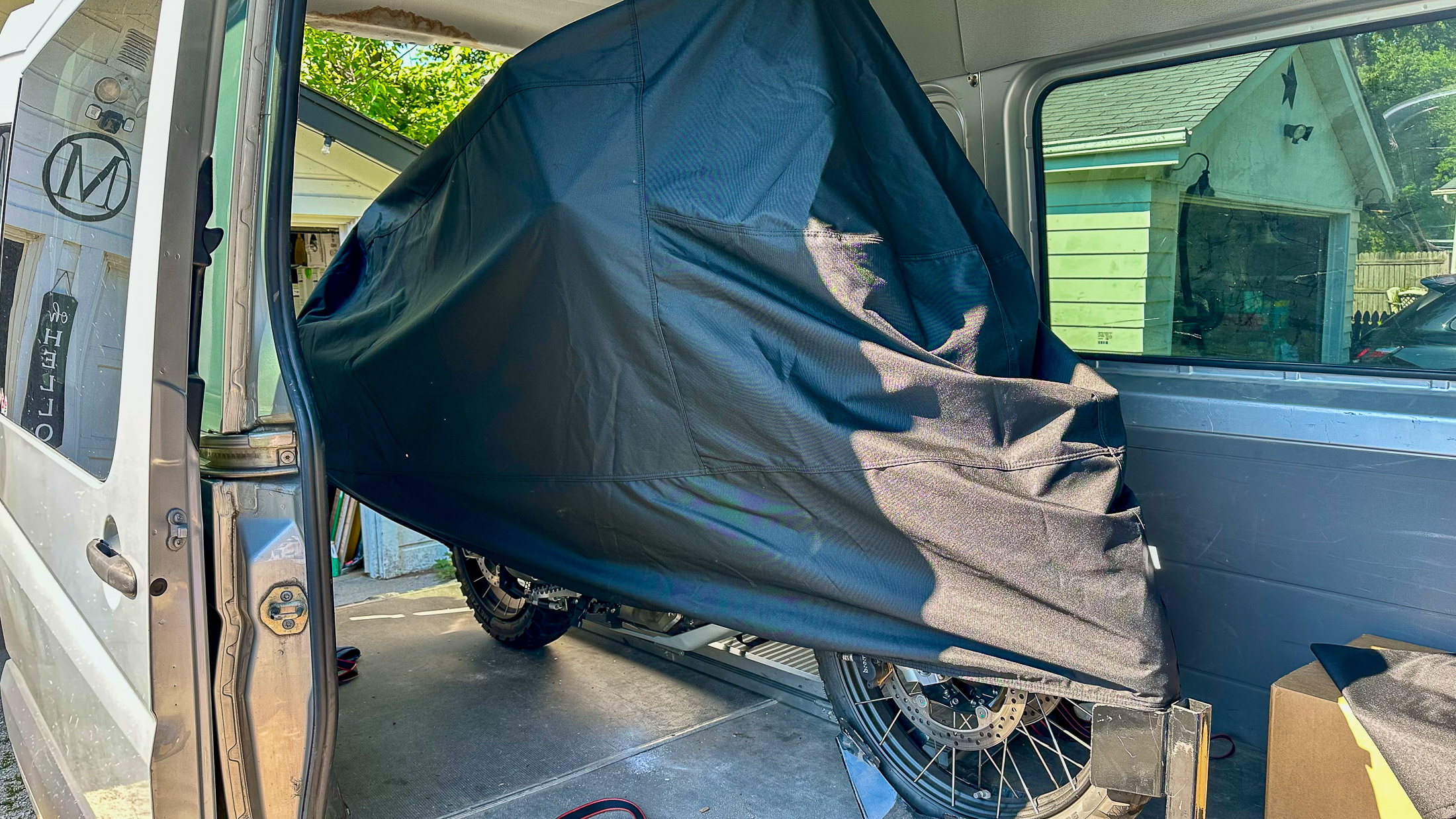 While we were there, I had a chance to test out the new bike cover I ordered online. It’s a heavy-duty one, really solid quality. I was a little worried it wouldn’t fit properly with all three boxes mounted, but to my relief, it was snug—but it fit.