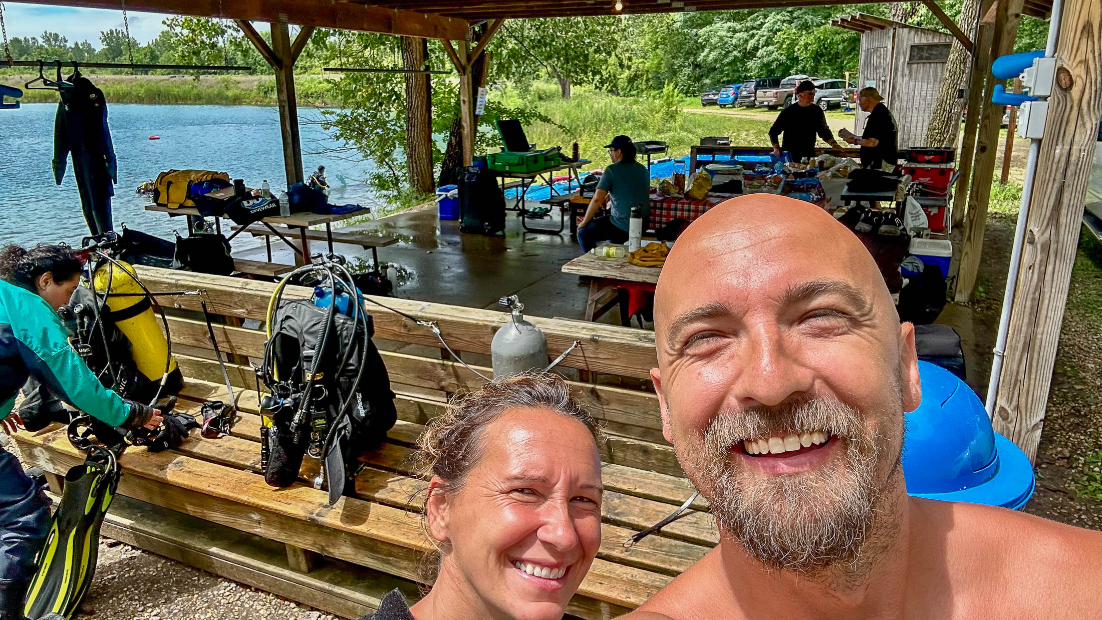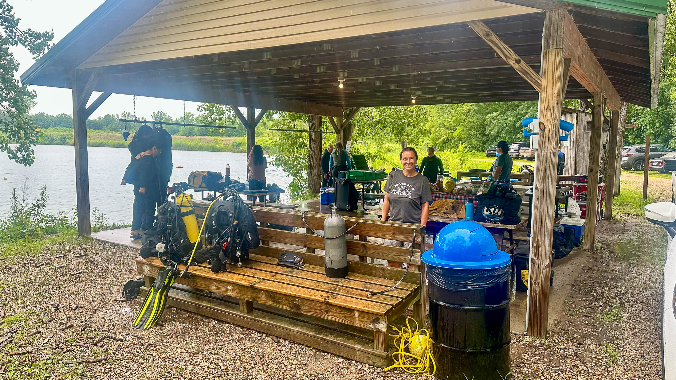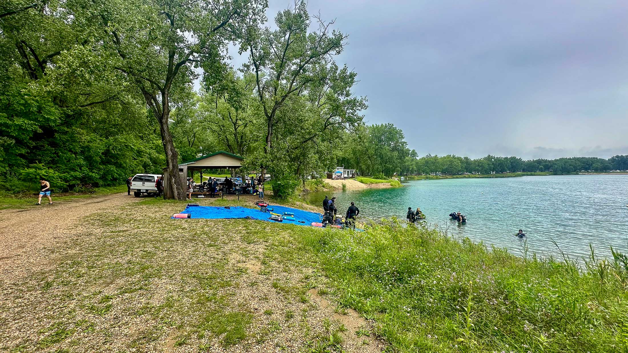 Our destination was Pearl Lake, a spring-fed sand quarry spanning 50 acres, nestled within a 207-acre property that includes over 300 RV spots. It’s home to a large public sandy beach, and for divers, there are designated entry points if you’re affiliated with a dive shop. Toucan Dive, the shop we got certified through back in 2007, has had the same dive spot for as long as we can remember.