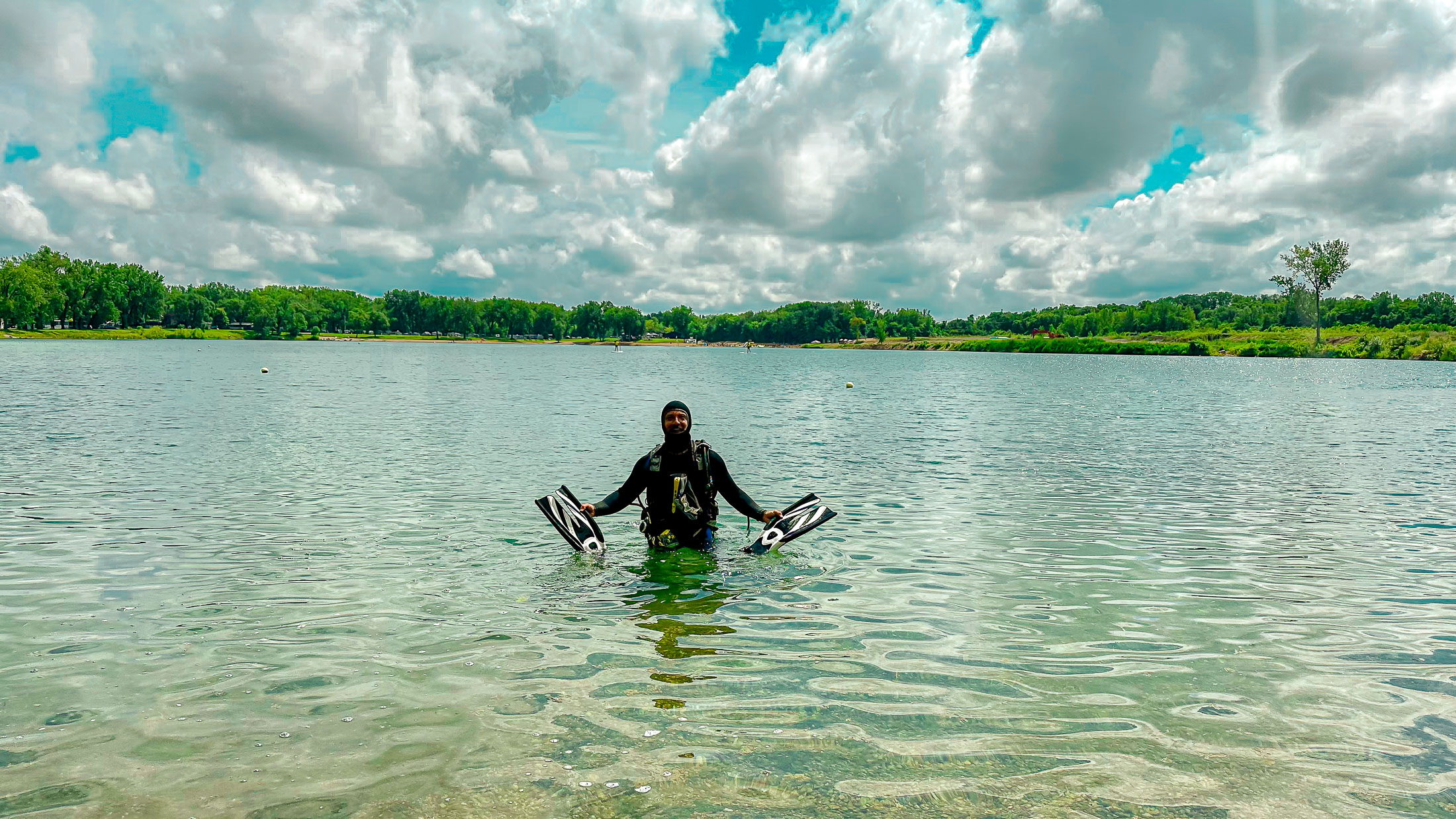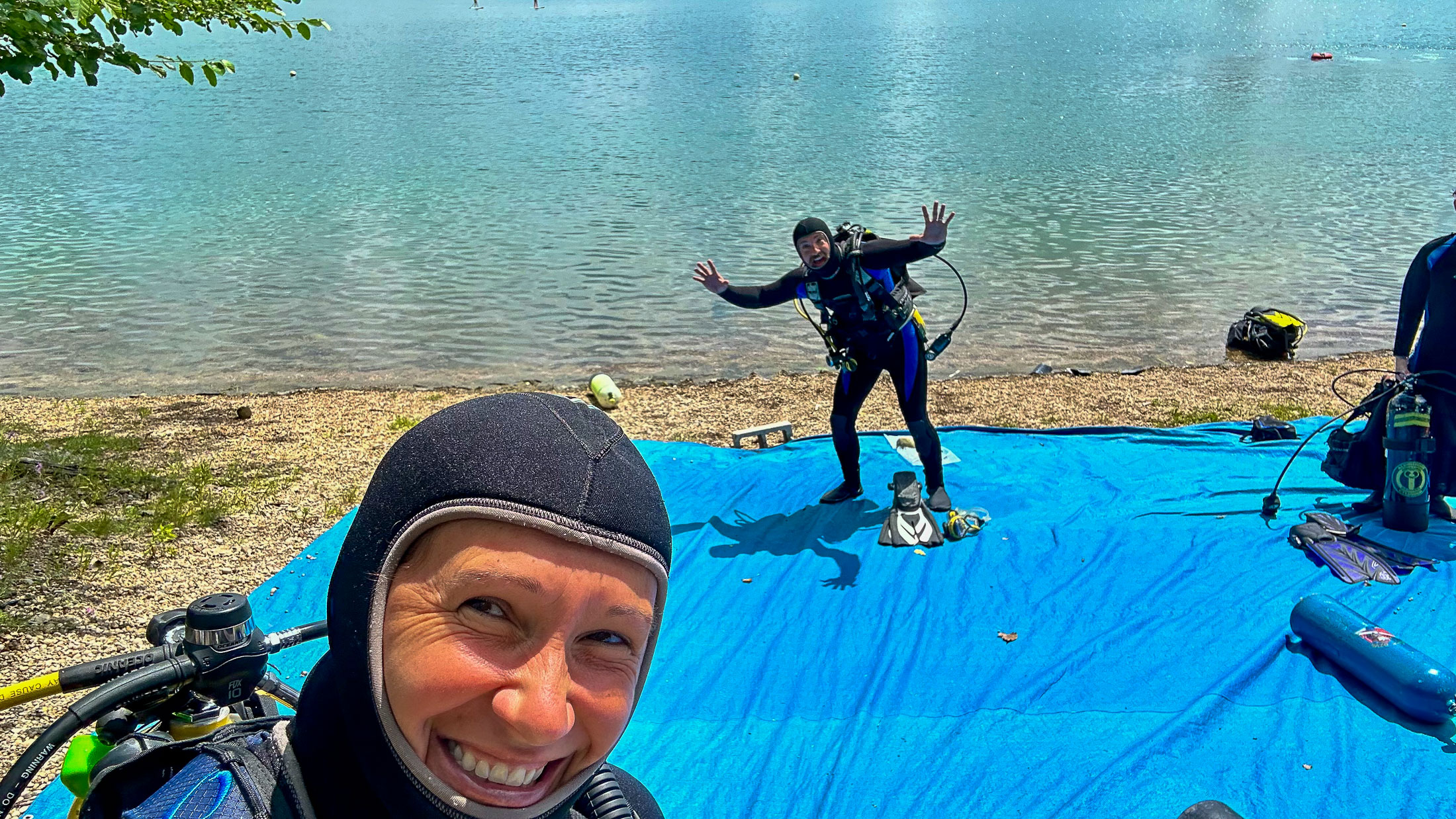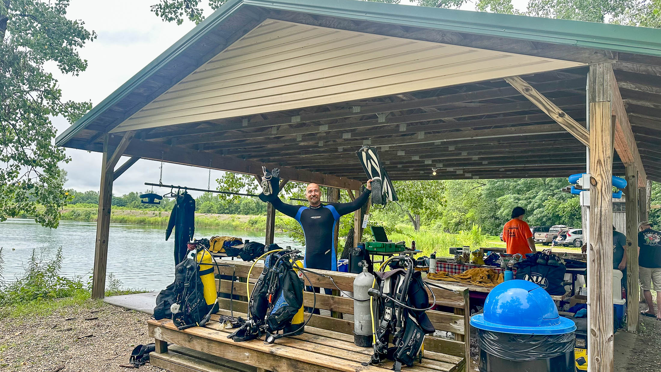 Our destination was Pearl Lake, a spring-fed sand quarry spanning 50 acres, nestled within a 207-acre property that includes over 300 RV spots. It’s home to a large public sandy beach, and for divers, there are designated entry points if you’re affiliated with a dive shop. Toucan Dive, the shop we got certified through back in 2007, has had the same dive spot for as long as we can remember.
