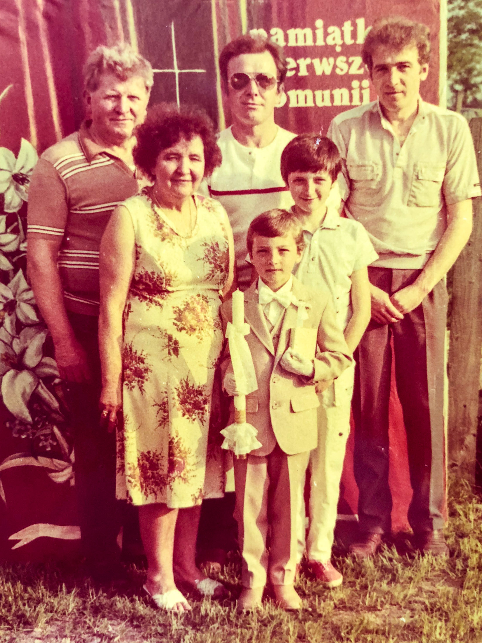 First Communion. My grandparents, Wujek Janusz (dad's brother), me, my cousin Darek and my dad.