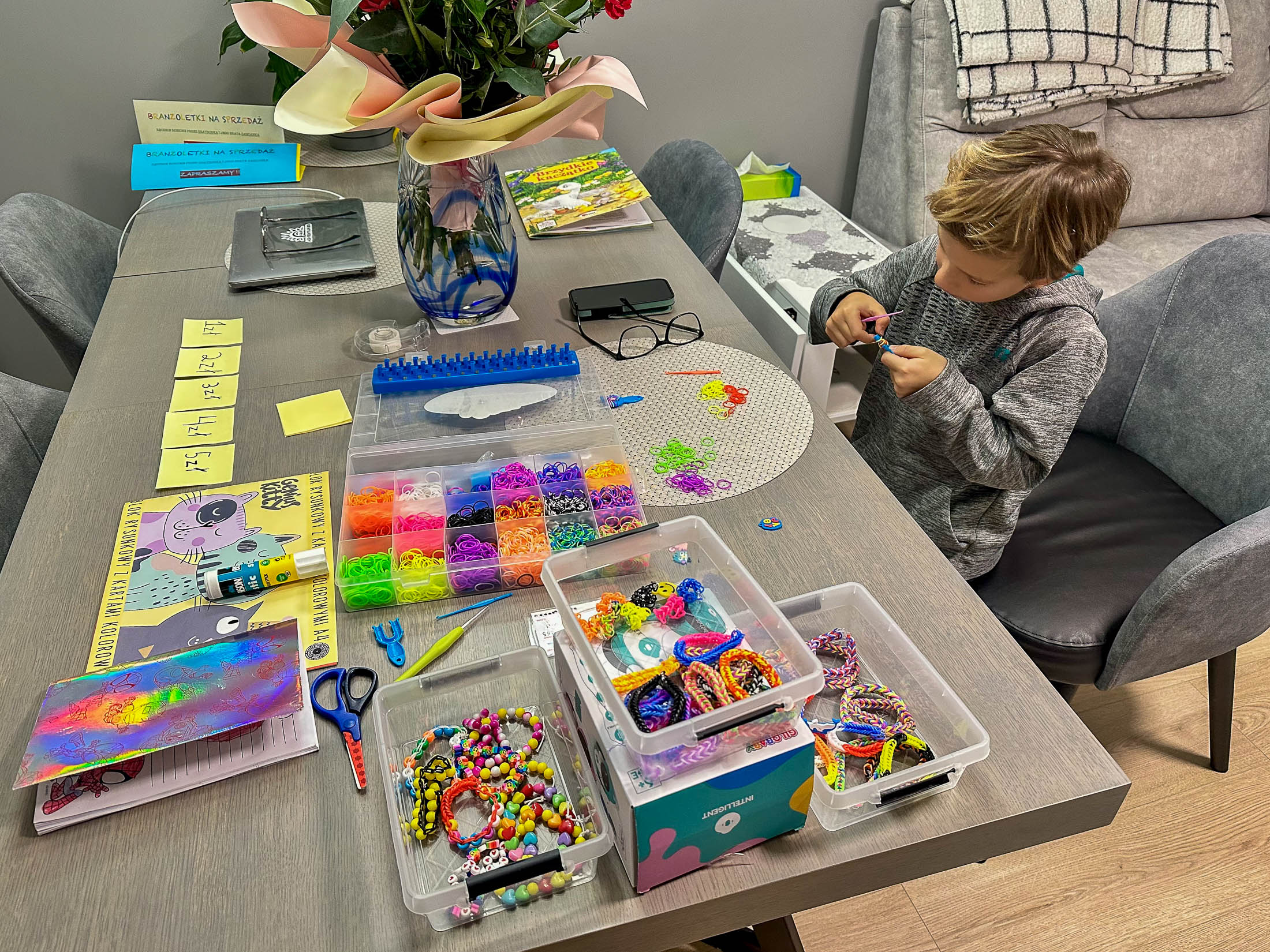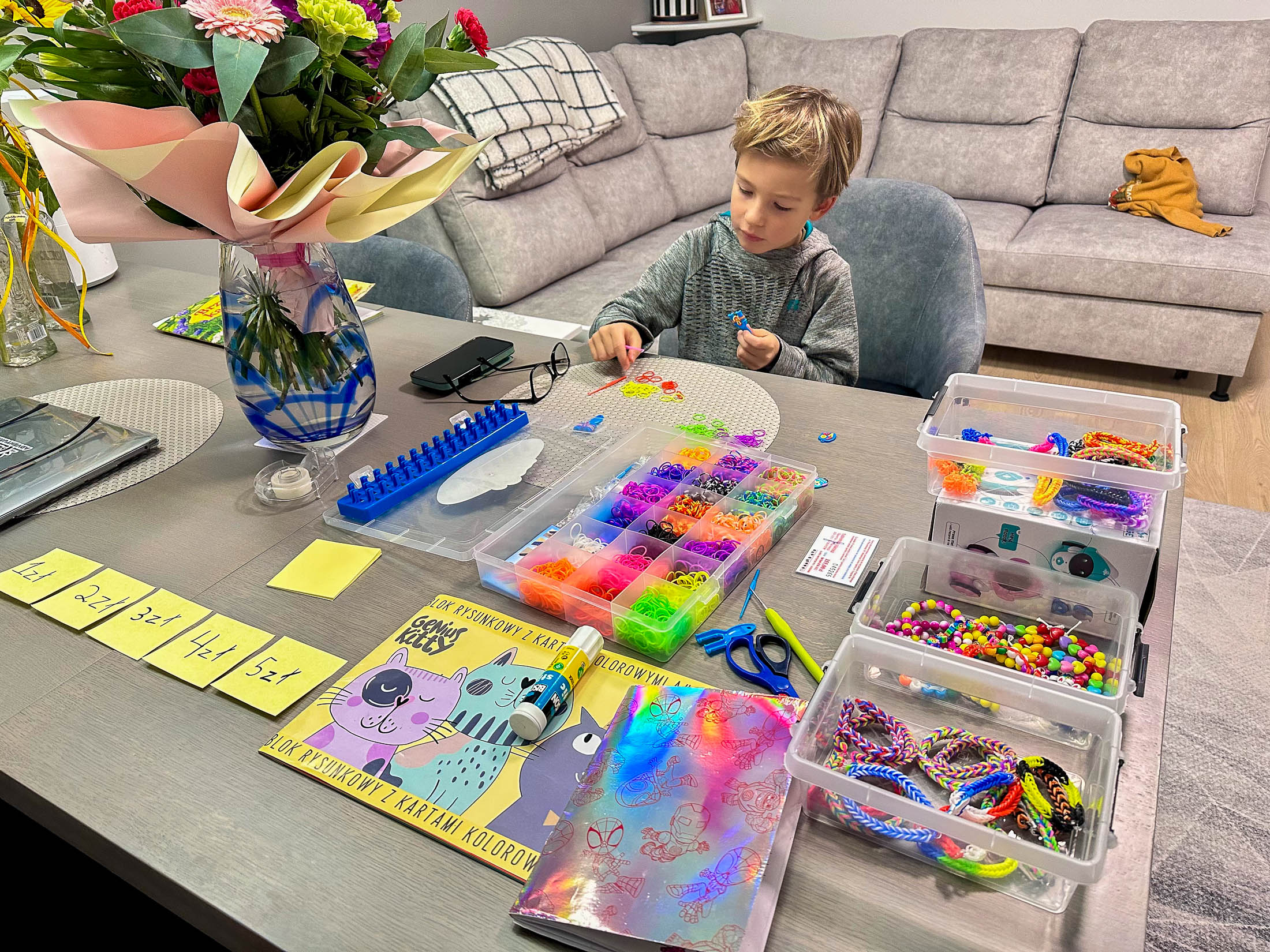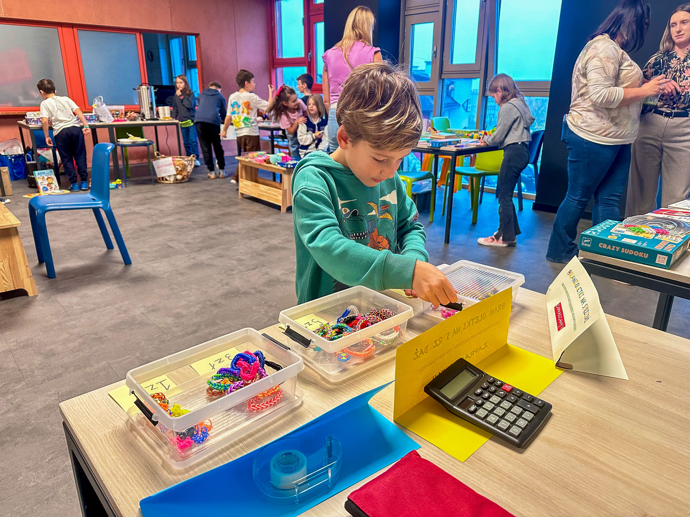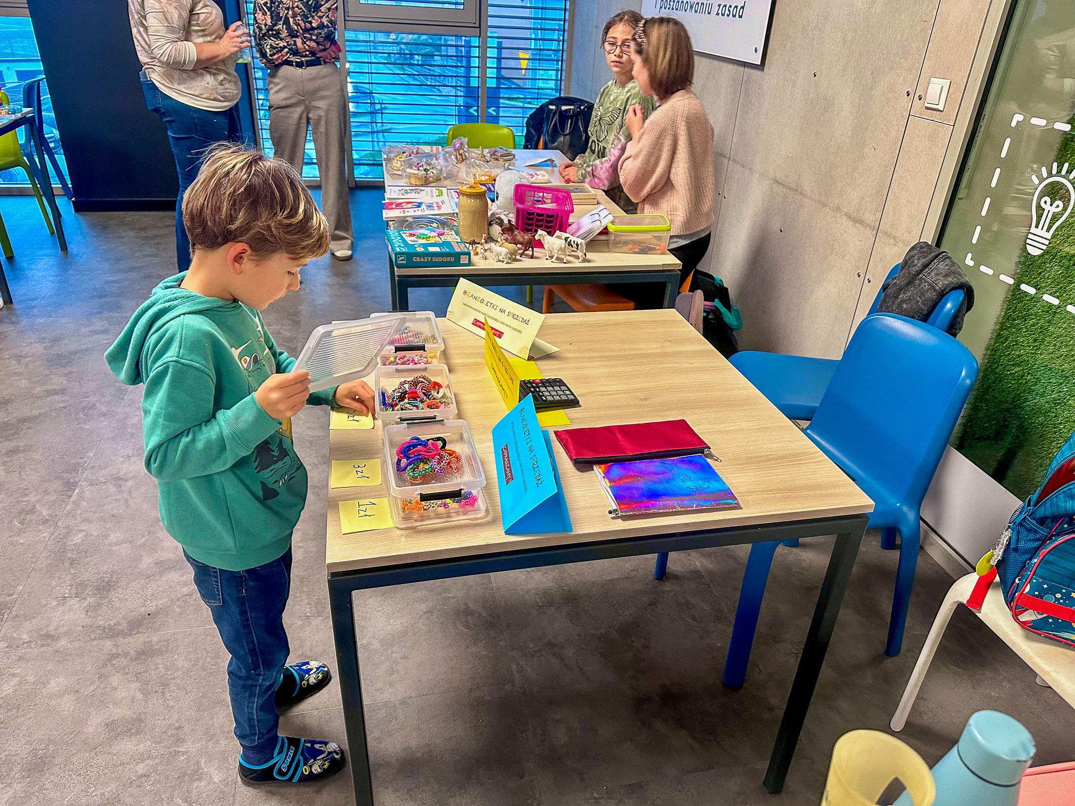 I arrived about fifteen minutes early, grabbed Grayson’s supplies from his locker, and set up his table. He joined shortly after, and by 2:15 p.m. he had made his first sale—a 5 zł bracelet proudly marked as “sold” in his notebook. After a few more sales, things got quiet for a bit, so I encouraged him to slightly lower the prices on the more expensive bracelets. He agreed—and the customers came. By the end of the event, he had sold 12 bracelets and earned about 40 złoty. Not bad for his first time, even if he probably spent more on other kids’ toys than he earned.