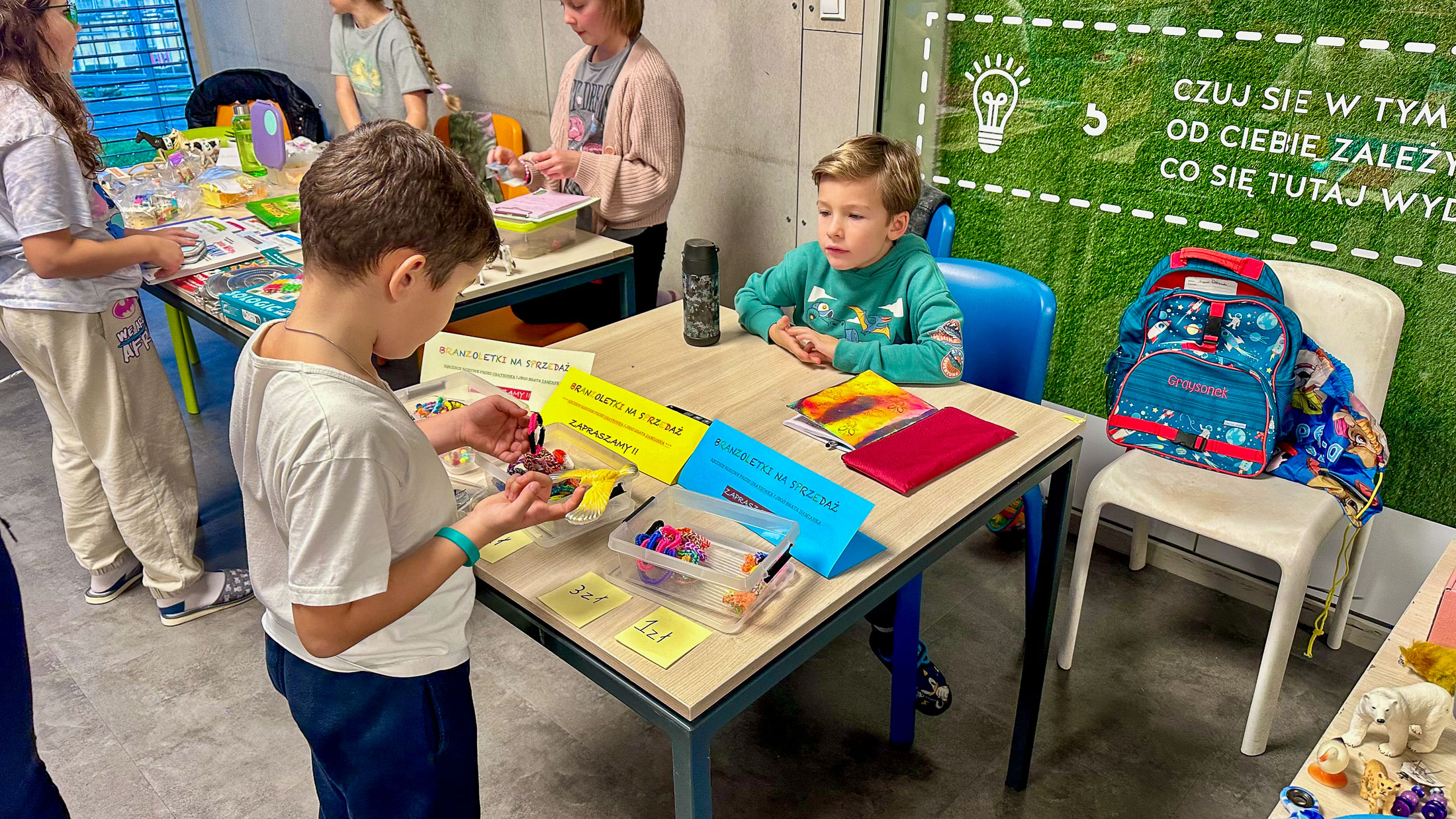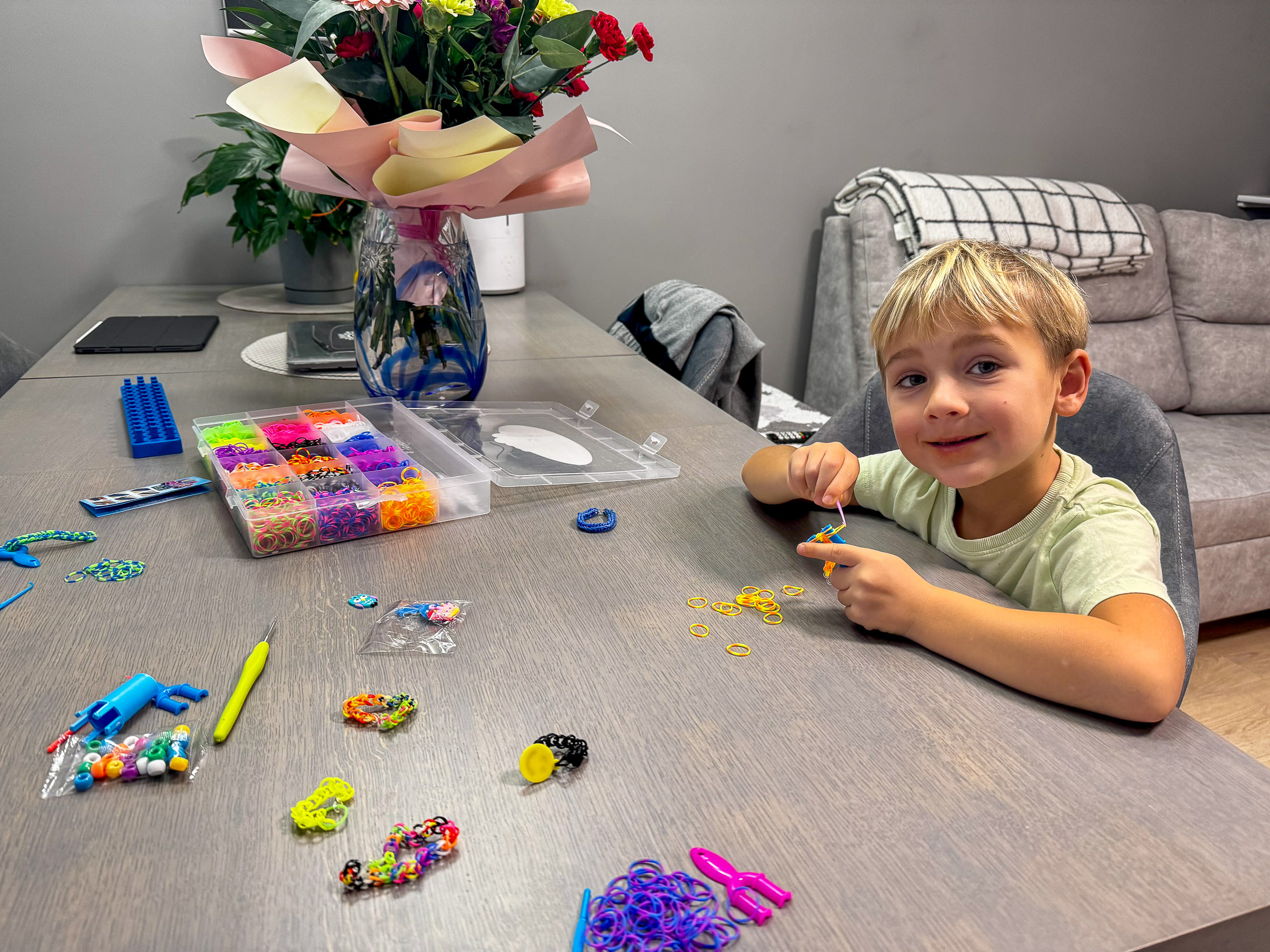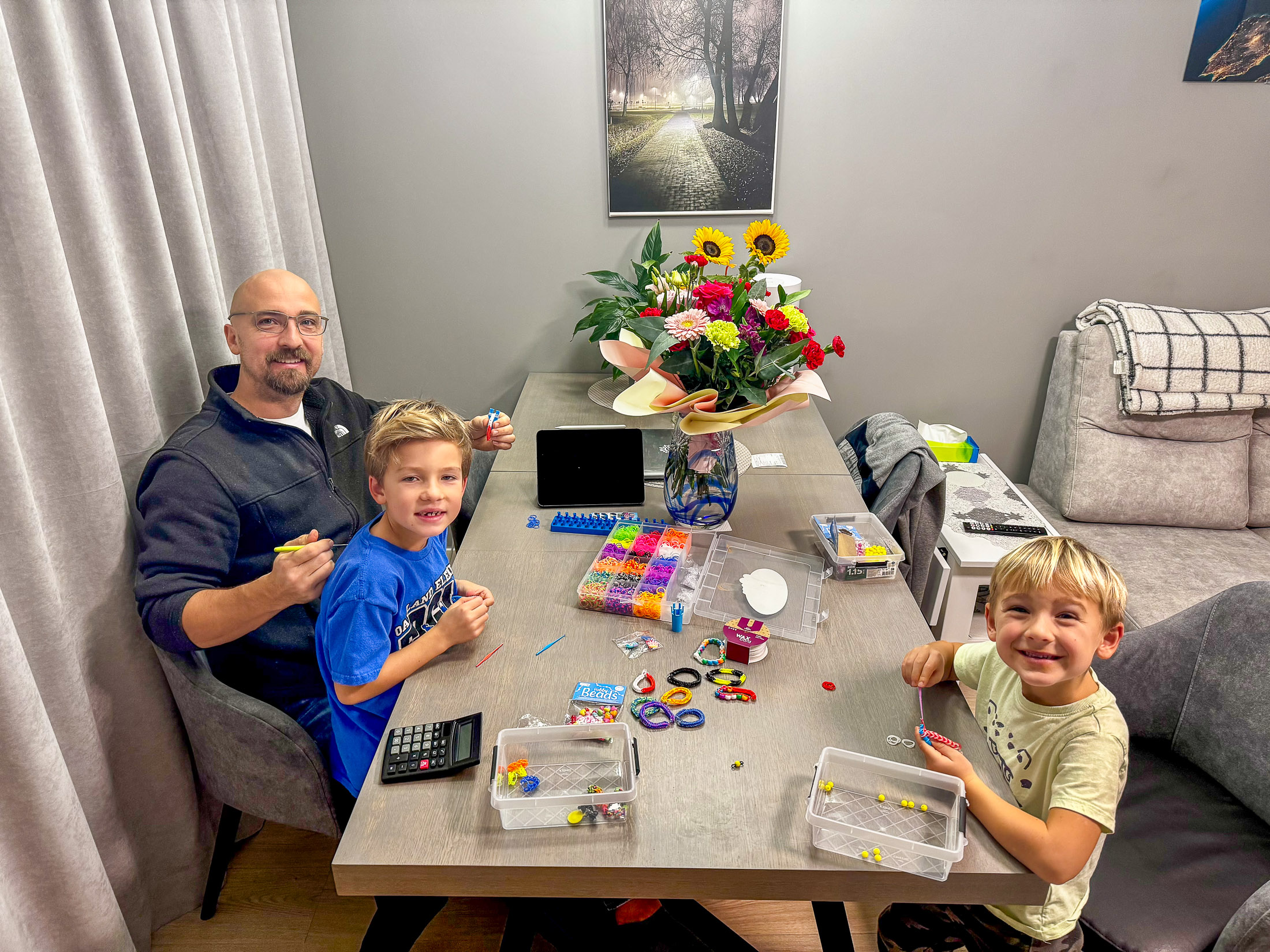 I arrived about fifteen minutes early, grabbed Grayson’s supplies from his locker, and set up his table. He joined shortly after, and by 2:15 p.m. he had made his first sale—a 5 zł bracelet proudly marked as “sold” in his notebook. After a few more sales, things got quiet for a bit, so I encouraged him to slightly lower the prices on the more expensive bracelets. He agreed—and the customers came. By the end of the event, he had sold 12 bracelets and earned about 40 złoty. Not bad for his first time, even if he probably spent more on other kids’ toys than he earned.