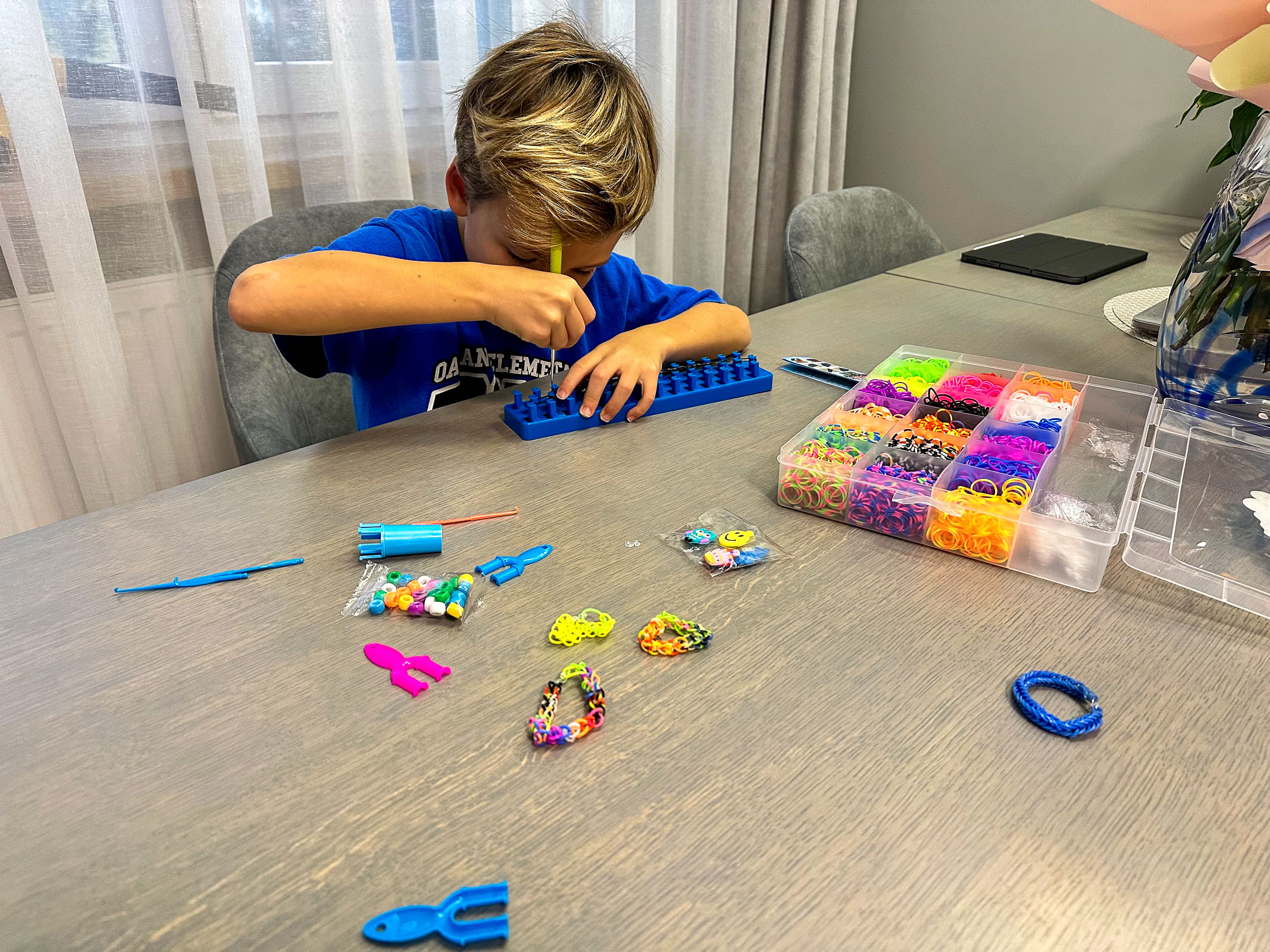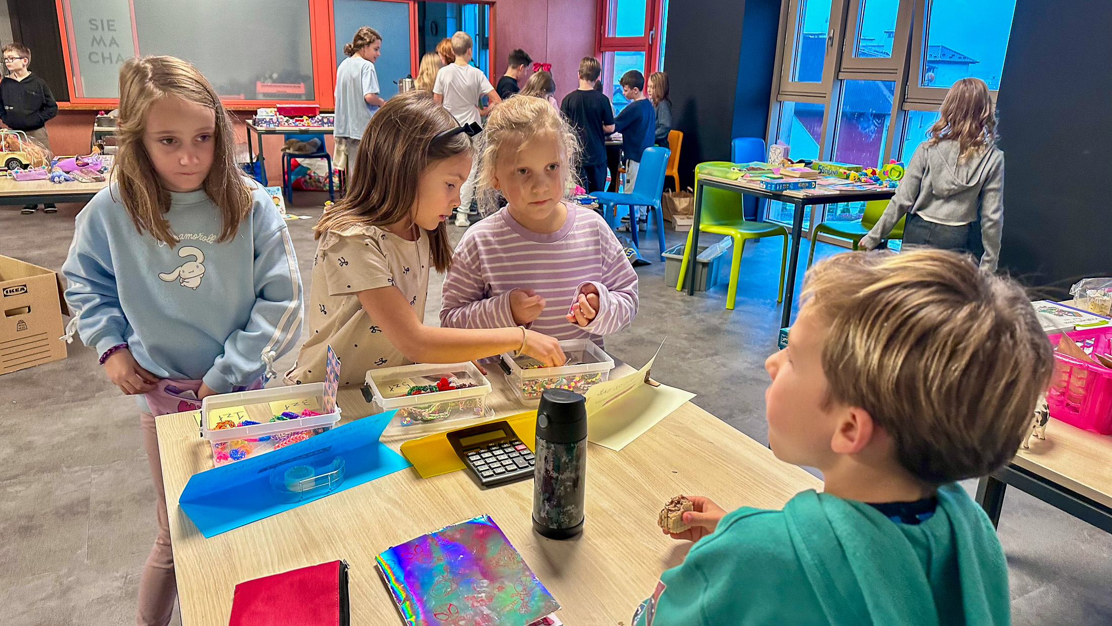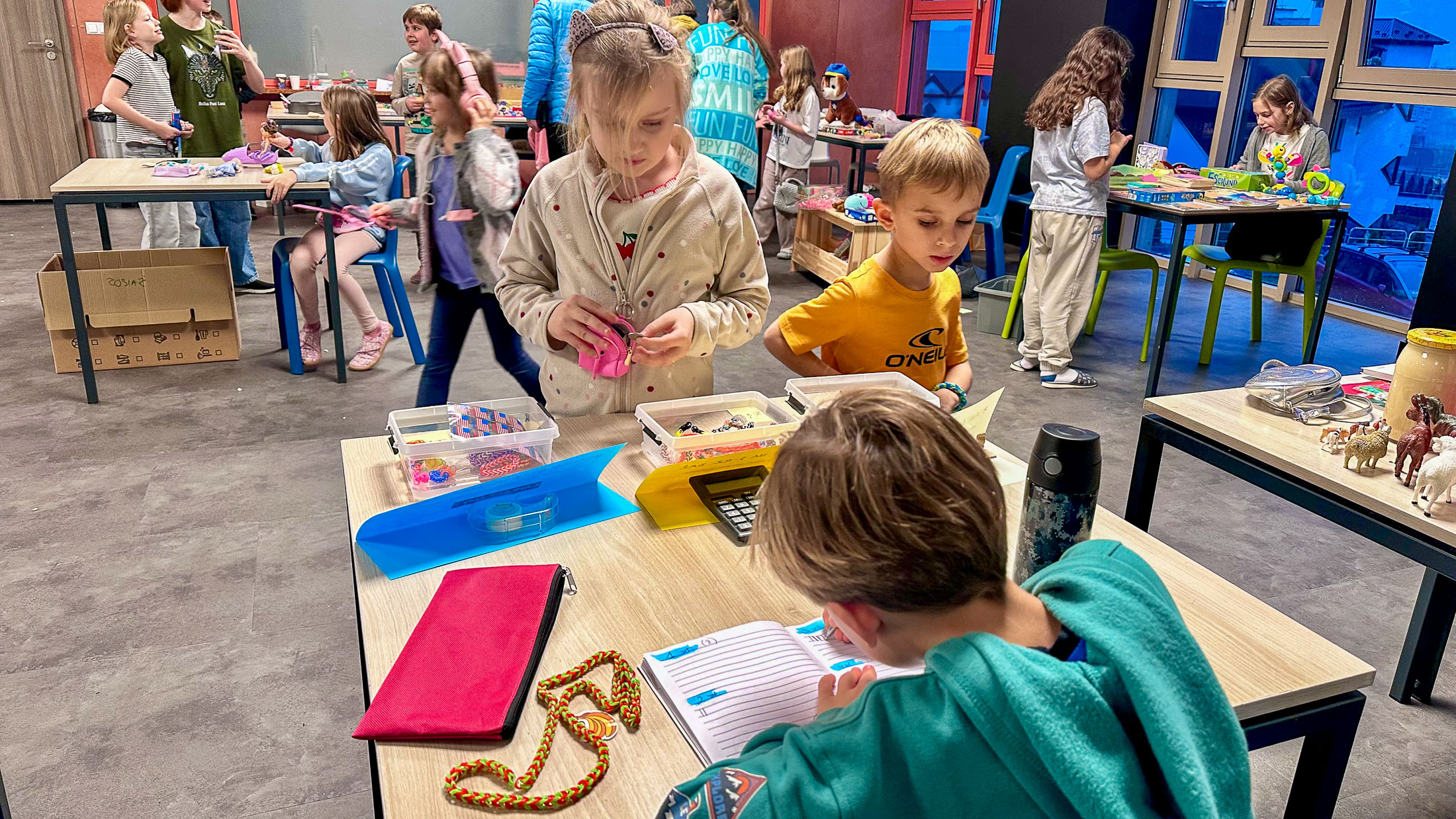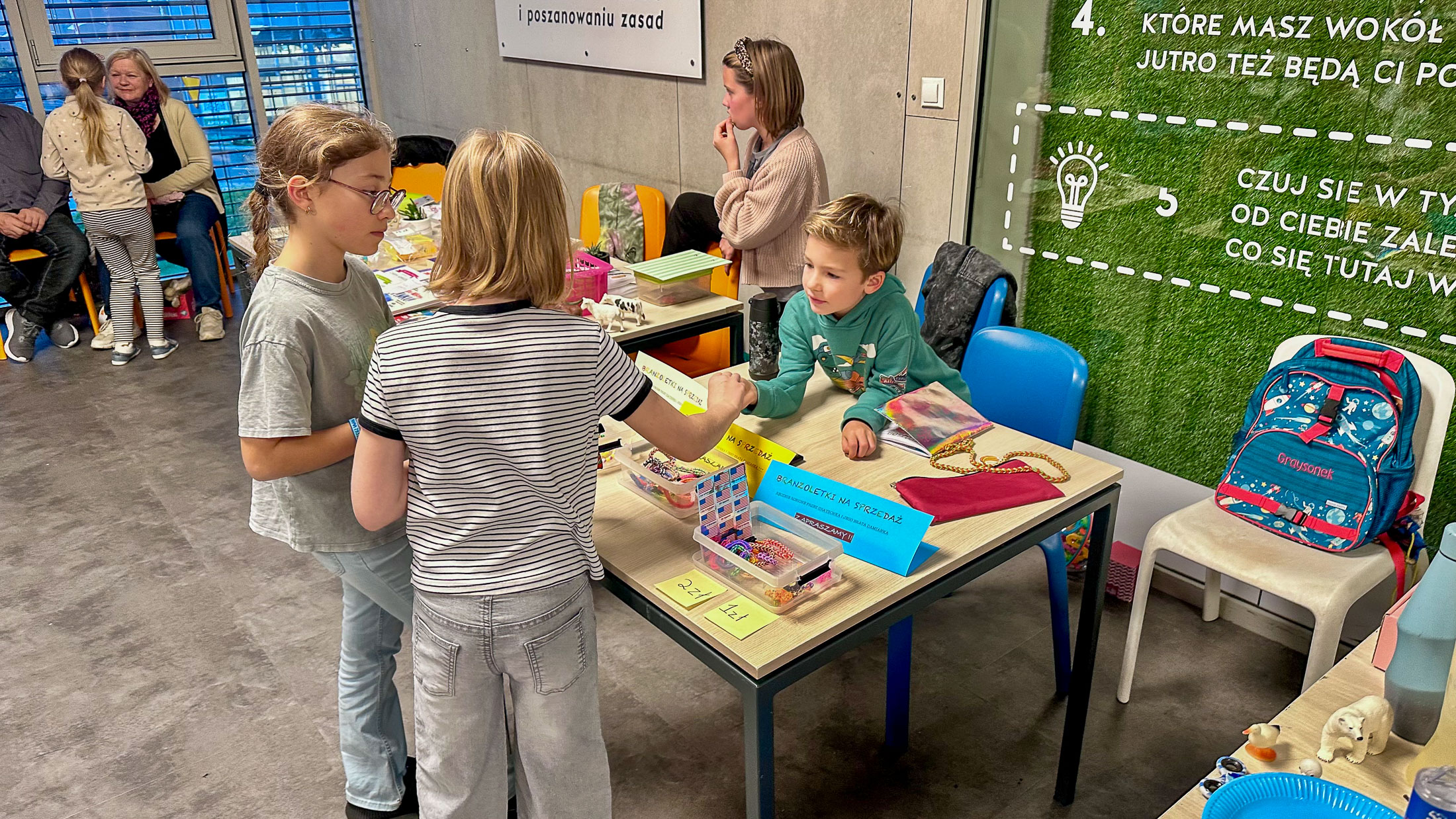 I arrived about fifteen minutes early, grabbed Grayson’s supplies from his locker, and set up his table. He joined shortly after, and by 2:15 p.m. he had made his first sale—a 5 zł bracelet proudly marked as “sold” in his notebook. After a few more sales, things got quiet for a bit, so I encouraged him to slightly lower the prices on the more expensive bracelets. He agreed—and the customers came. By the end of the event, he had sold 12 bracelets and earned about 40 złoty. Not bad for his first time, even if he probably spent more on other kids’ toys than he earned.