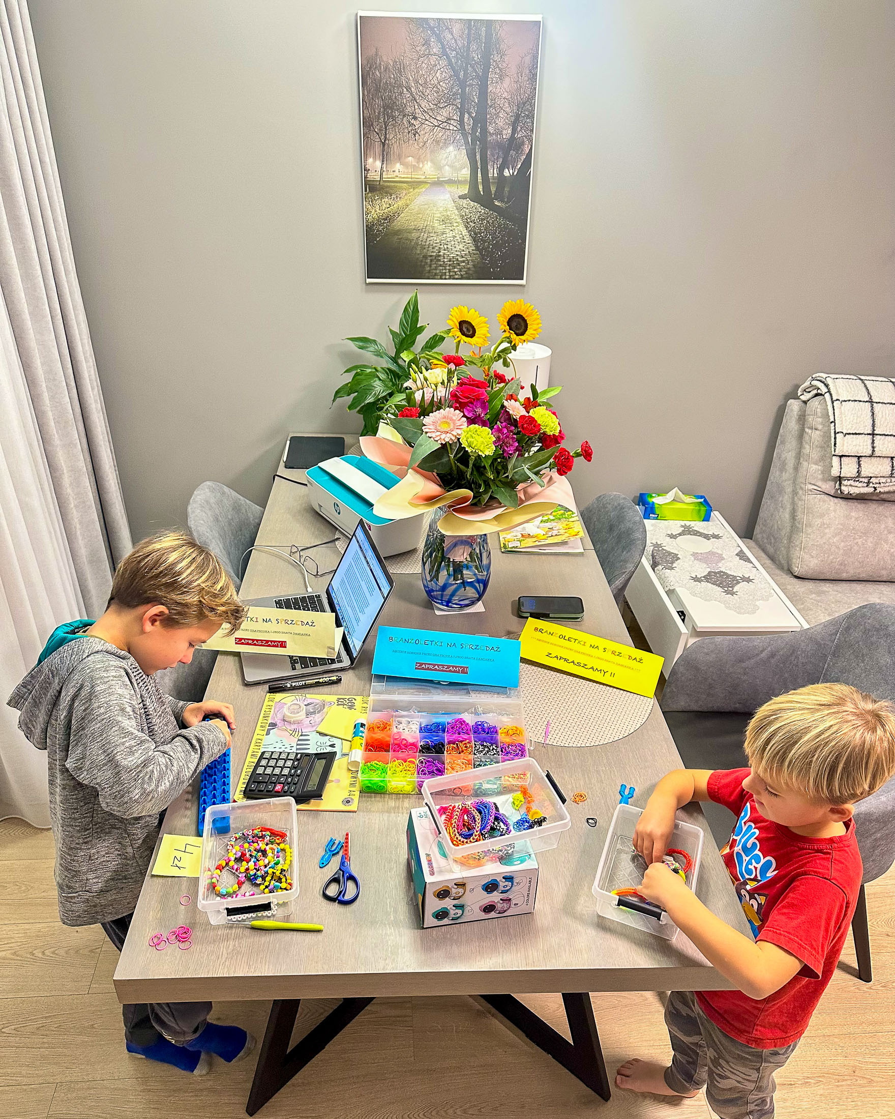 The entire weekend turned into a bracelet workshop. It became a full family affair, and by Sunday night we had made around 60 bracelets. We added a notebook, a calculator, and some little signs for his table setup. We also included a small stash of change so he’d be prepared if customers paid with larger bills. Once everything was ready, we counted the bracelets, set prices, and calculated his profit potential. If he sold out, he could easily double the initial 70 złoty investment. Realistically, we just hoped he would at least break even—and learn a great lesson in finance and sales along the way.